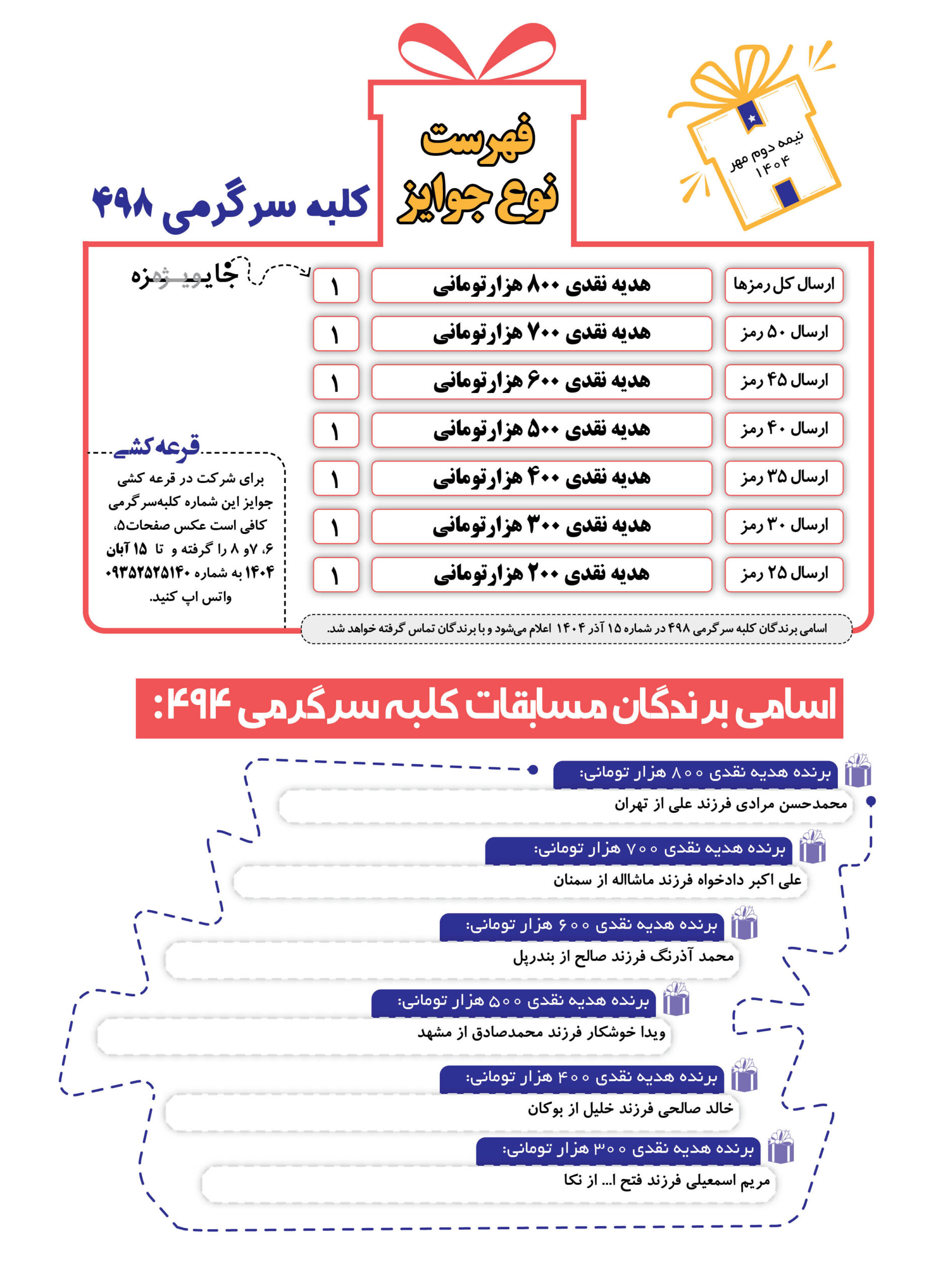 اسامی برندگان کلبه سرگرمی ۴۹۴
